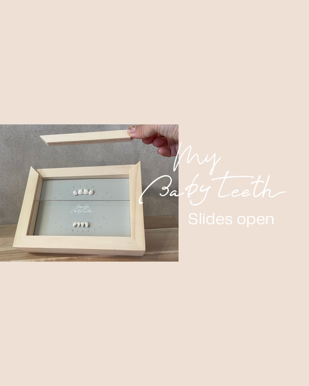 心温まる思い出をインテリアに BABYTEETHART(乳歯アート)は、お子様の乳歯を保存するだけでなく、アートとして飾ることができる新しいスタイルのインテリアアイテムです。 淡い色合いやシンプルなフォルムは、さまざまなインテリアにマッチし、育児の大切な思い出をより特別なものにしてくれます。 お子様の成長を形に残し、乳歯の抜け替わる大切な時期をご家族みんなでお楽しみいただけます。 color:gray(グレー) size:高さ約12cm、幅約5.8cm、奥行き約4.2cm flame ・木製:パイン集合材 ・製造国:日本 ・表面はスライドで開閉できるアクリル窓 ・背面にはマグネット(カードと粘着剤を挟んだクリップを保存可能)、スタンドスティック収容 ・木材の特性上、木目や色味は一点ごとに異なります。商品の魅力としてお楽しみいただければ幸いです。 ※商品は表面のアクリルに保護フィルムを貼った状態でお届けします。 フィルムを剥がす際に、微細な木くずが付着している場合があります。その際は、やわらかい布で軽く取り除いてからご使用ください。 【セット内容】 乳歯アート台紙入りフレーム、粘着剤、カード、スタンドスティック ・カード(BABYTEETHART ロゴ)裏側に、乳歯が抜けた日付を記載できます。 ・使用しない時は、背面のマグネットに取り付け可能。 【乳歯取り付け方法】 ・袋の中の粘着剤をちぎり、柔らかくなるまで指でこねて付けます。 ・接着剤の大きさは、小さな前歯直径2〜3ミリ程度。奥歯は空洞の中に粘着剤を入れ、少しはみ出る程度にすると取り付けやすいです。 【配送の目安】 ・ご注文をいただいてから手作業制作いたしますので、発送まで3日〜7日ほどお時間をいただきます。 ・お急ぎの場合は、事前にお問い合わせください。 【梱包について】 心を込めてラッピングいたします。ご出産祝いやお誕生日などのプレゼントにもぴったりです。 お子様のお名前をお入れ致します。