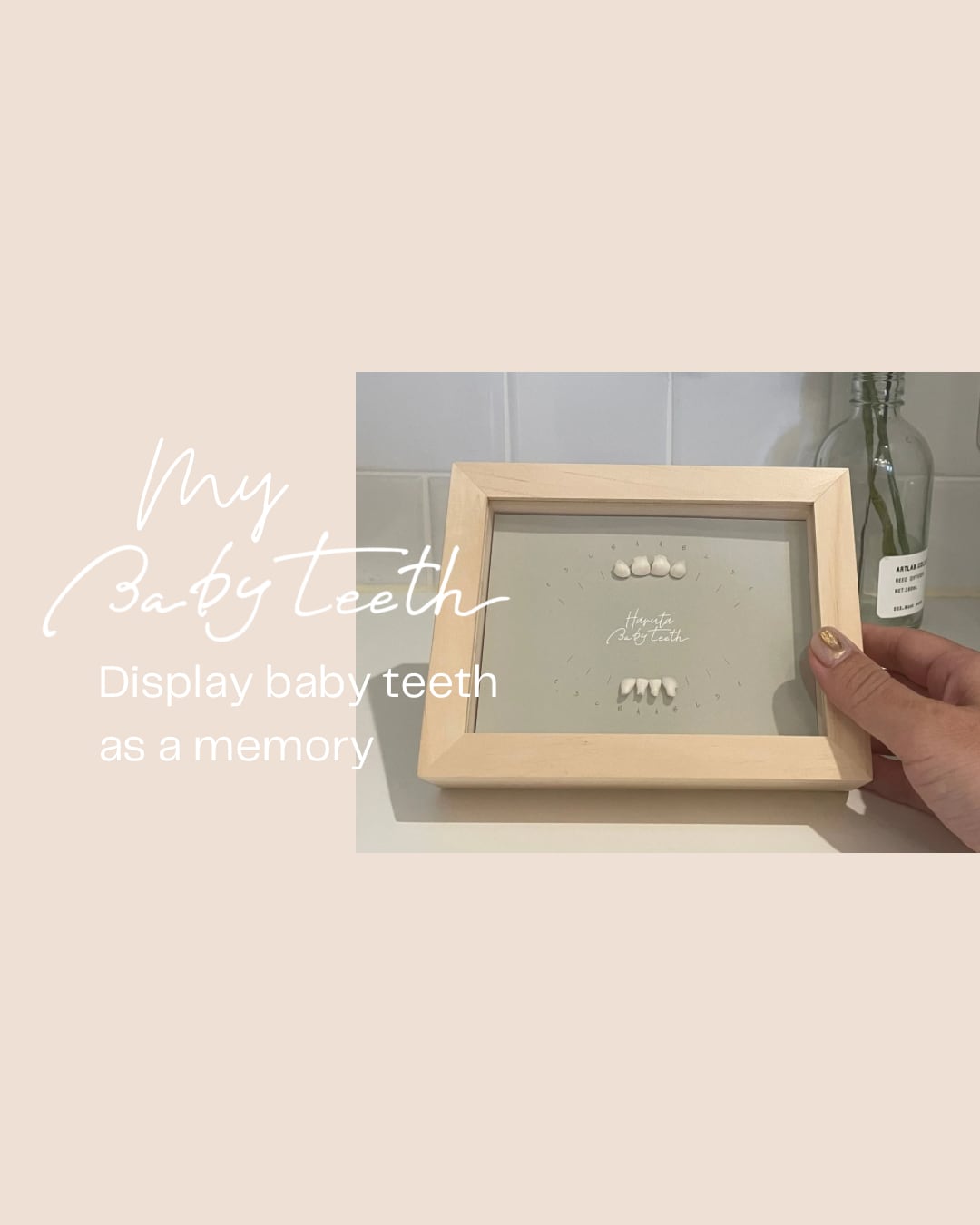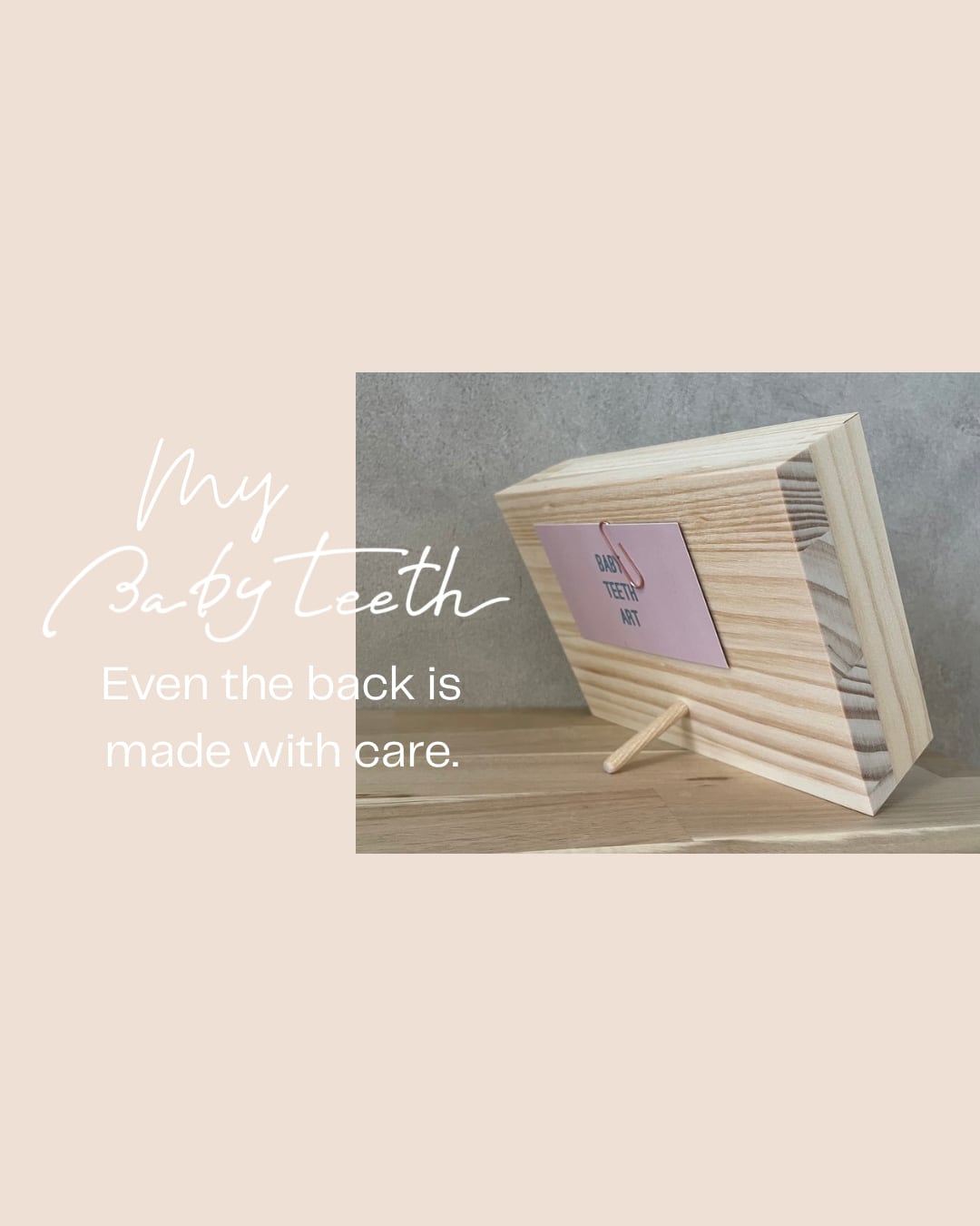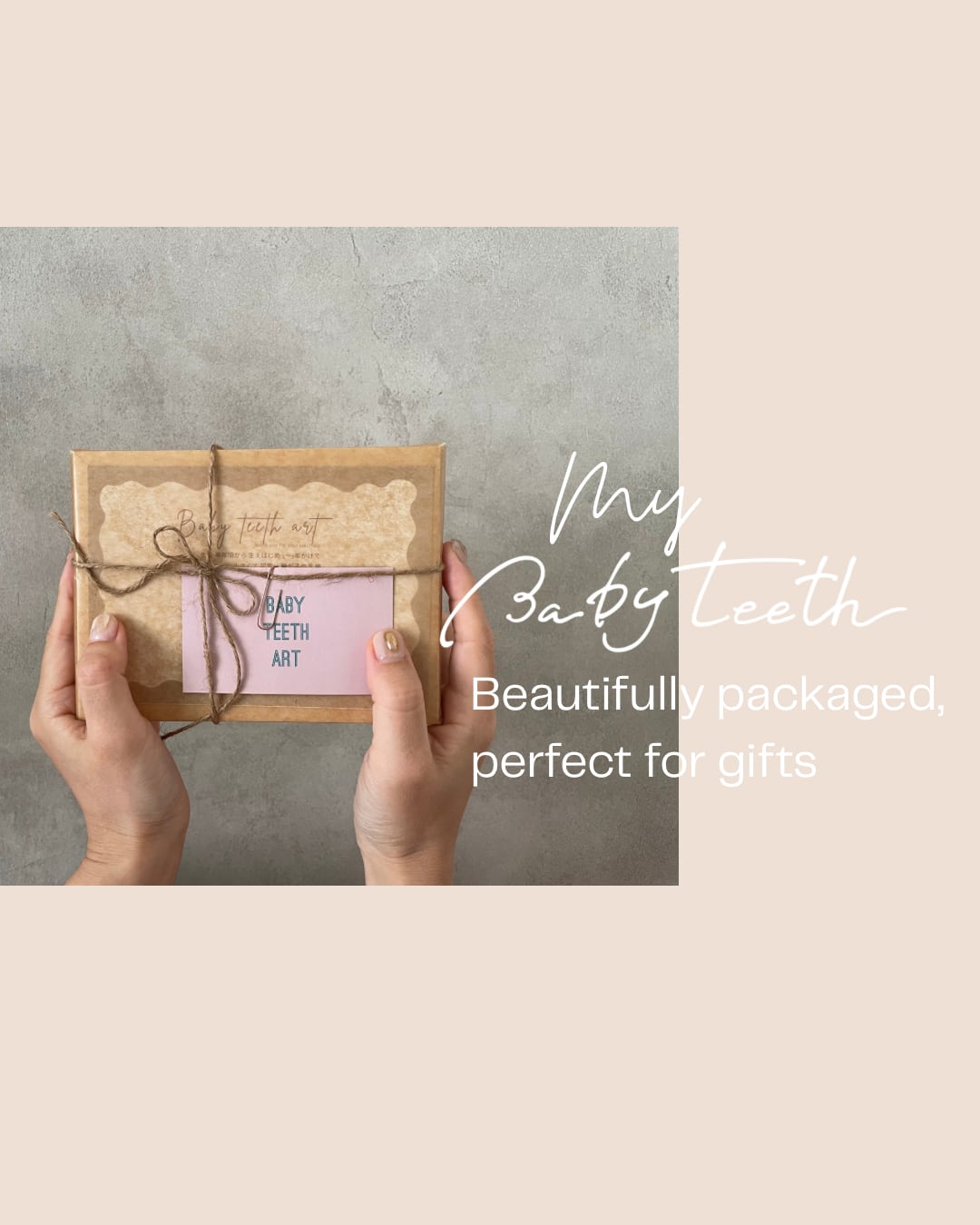 心温まる思い出をインテリアに BABYTEETHART(乳歯アート)は、お子様の乳歯を保存するだけでなく、アートとして飾ることができる新しいスタイルのインテリアアイテムです。 淡い色合いやシンプルなフォルムは、さまざまなインテリアにマッチし、育児の大切な思い出をより特別なものにしてくれます。 お子様の成長を形に残し、乳歯の抜け替わる大切な時期をご家族みんなでお楽しみいただけます。 color:moka(モカ) size:高さ約12cm、幅約5.8cm、奥行き約4.2cm flame ・木製:パイン集合材 ・製造国:日本 ・表面はスライドで開閉できるアクリル窓 ・背面にはマグネット(カードと粘着剤を挟んだクリップを保存可能)、スタンドスティック収容 ・木材の特性上、木目や色味は一点ごとに異なります。商品の魅力としてお楽しみいただければ幸いです。 ※商品は表面のアクリルに保護フィルムを貼った状態でお届けします。 フィルムを剥がす際に、微細な木くずが付着している場合があります。その際は、やわらかい布で軽く取り除いてからご使用ください。 【セット内容】 乳歯アート台紙入りフレーム、粘着剤、カード、スタンドスティック ・カード(BABYTEETHART ロゴ)裏側に、乳歯が抜けた日付を記載できます。 ・使用しない時は、背面のマグネットに取り付け可能。 【乳歯取り付け方法】 ・袋の中の粘着剤をちぎり、柔らかくなるまで指でこねて付けます。 ・接着剤の大きさは、小さな前歯直径2〜3ミリ程度。奥歯は空洞の中に粘着剤を入れ、少しはみ出る程度にすると取り付けやすいです。 【配送の目安】 ・ご注文をいただいてから手作業制作いたしますので、発送まで3日〜7日ほどお時間をいただきます。 ・お急ぎの場合は、事前にお問い合わせください。 【梱包について】 心を込めてラッピングいたします。ご出産祝いやお誕生日などのプレゼントにもぴったりです。 お子様のお名前をお入れ致します。