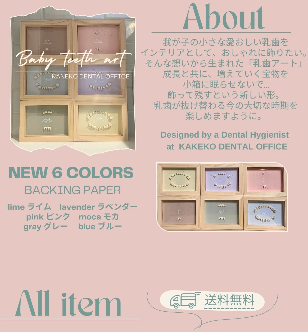 心温まる思い出をインテリアに BABYTEETHART(乳歯アート)は、お子様の乳歯を保存するだけでなく、アートとして飾ることができる新しいスタイルのインテリアアイテムです。 淡い色合いやシンプルなフォルムは、さまざまなインテリアにマッチし、育児の大切な思い出をより特別なものにしてくれます。 お子様の成長を形に残し、乳歯の抜け替わる大切な時期をご家族みんなでお楽しみいただけます。 color:pink(ピンク) size:高さ約12cm、幅約5.8cm、奥行き約4.2cm flame ・木製:パイン集合材 ・製造国:日本 ・表面はスライドで開閉できるアクリル窓 ・背面にはマグネット(カードと粘着剤を挟んだクリップを保存可能)、スタンドスティック収容 ・木材の特性上、木目や色味は一点ごとに異なります。商品の魅力としてお楽しみいただければ幸いです。 ※商品は表面のアクリルに保護フィルムを貼った状態でお届けします。 フィルムを剥がす際に、微細な木くずが付着している場合があります。その際は、やわらかい布で軽く取り除いてからご使用ください。 【セット内容】 乳歯アート台紙入りフレーム、粘着剤、カード、スタンドスティック ・カード(BABYTEETHART ロゴ)裏側に、乳歯が抜けた日付を記載できます。 ・使用しない時は、背面のマグネットに取り付け可能。 【乳歯取り付け方法】 ・袋の中の粘着剤をちぎり、柔らかくなるまで指でこねて付けます。 ・接着剤の大きさは、小さな前歯直径2〜3ミリ程度。奥歯は空洞の中に粘着剤を入れ、少しはみ出る程度にすると取り付けやすいです。 【配送の目安】 ・ご注文をいただいてから手作業制作いたしますので、発送まで3日〜7日ほどお時間をいただきます。 ・お急ぎの場合は、事前にお問い合わせください。 【梱包について】 心を込めてラッピングいたします。ご出産祝いやお誕生日などのプレゼントにもぴったりです。 お子様のお名前をお入れ致します。
